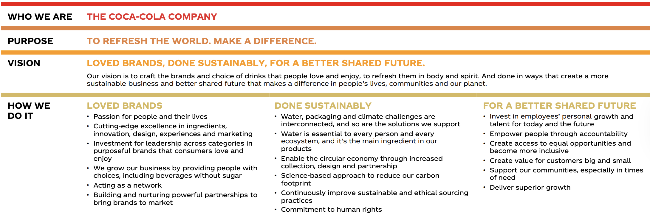 For instance, Coca-Cola’s purpose is: “Refresh the world. Make a difference.” The purpose trickles down to its vision: “loved brands, done sustainably, for a better shared future,” which directs how it conducts business. (Coca-Cola) Coca-Cola’s environmental sustainability priorities are “water, packaging, climate and agriculture.” (Coca-Cola) The company’s resources demonstrate how its purpose and sustainability strategy are intertwined and disseminated across its operations.